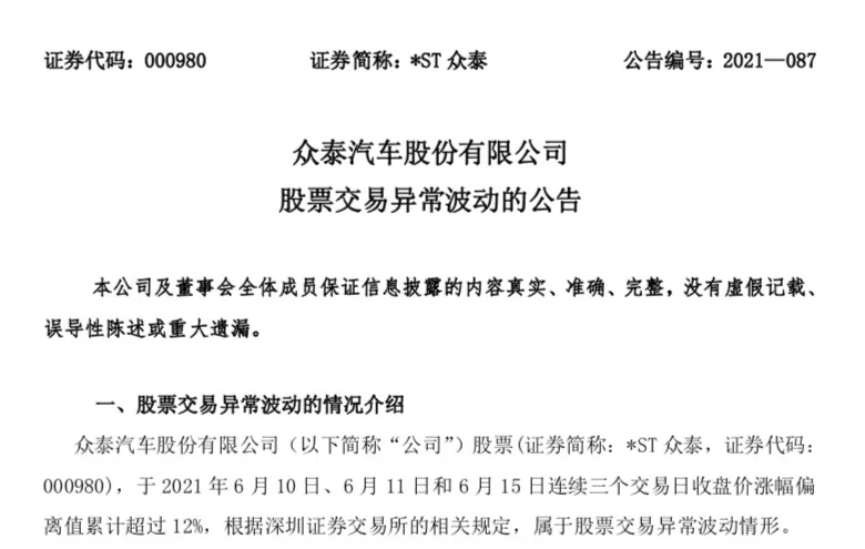 然而,就是这样一家问题缠身的公司,股价却连连攀升。今年*ST众泰曾在40个交易日内收获30个涨停。今日晚间,*ST众泰发布公告称,众泰汽车股份有限公司股票于2021年6月10日、6月11日和6月15日连续三个交易日收盘价涨幅偏离值累计超过12%。截至目前,公司、控股股东和实际控制人不存在关于公司的应披露而未披露的重大事项,或处于筹划阶段的重大事项。